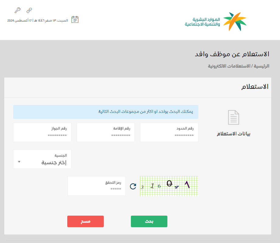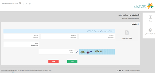 - يتم إدخال رقم الإقامة أو رقم الحدود أو رقم الهوية الوطنية للاستعلام عن العامل.